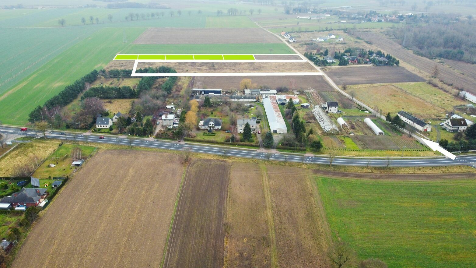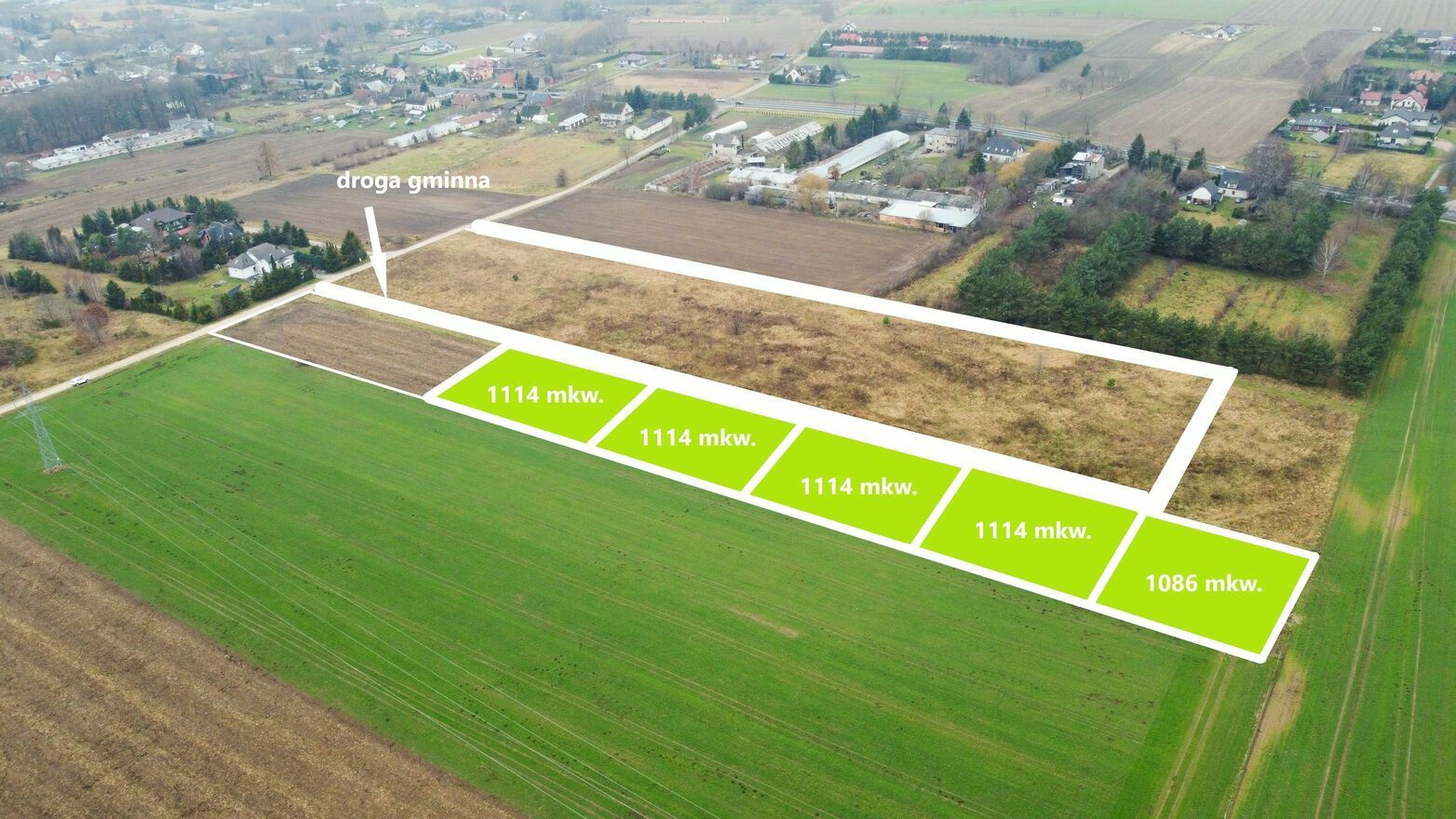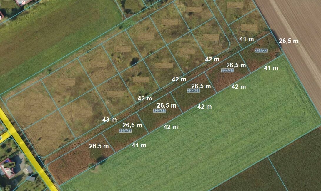 Kompleks składa się z pięciu wydzielonych działek ewidencyjnych: 223/23, 223/24, 223/25, 223/26 i 223/27. Powierzchnie działek mieszczą się w przedziale 0,1086 ha – 0,1114 ha, co daje idealny metraż pod komfortowy dom jednorodzinny z ogrodem.